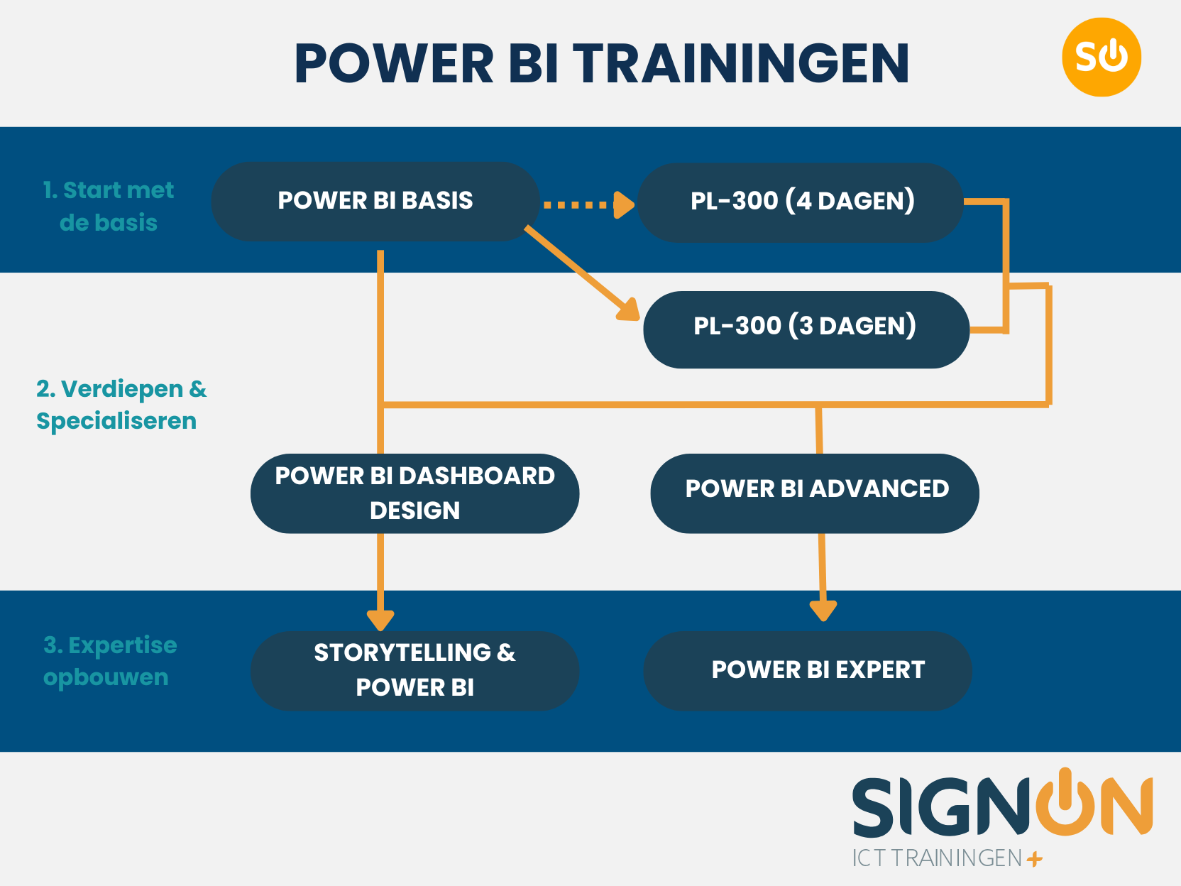 Je kan verschillende routes volgen bij SignOn om jouw Power BI kennis uit te breiden. Afhankelijk van je leerdoelen, hieronder mogelijke routes. Hulp nodig? Neem contact met ons op voor vrijblijvend advies.