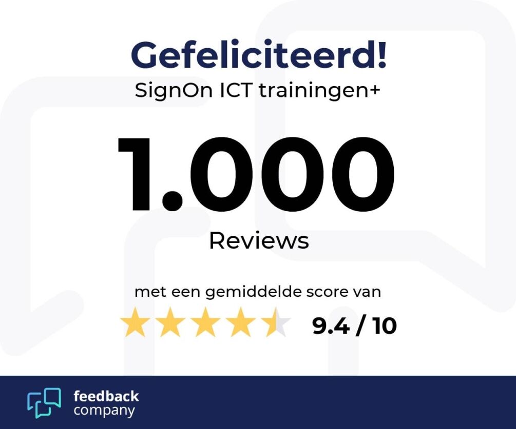 “De deelnemers aan onze trainingen zijn vaak op zoek naar een ICT-training om hun kennis op peil te brengen of te houden, willen zich omscholen voor een nieuwe baan, of worstelen op hun werk met een bepaald software-probleem en zoeken daar een oplossing voor,” vertelt Franklin Frijling, Managing Director bij SignOn. “Achteraf krijgen we herhaaldelijk te horen dat cursisten in onze trainingen vinden wat ze zochten en dat ze het geleerde direct in de dagelijkse praktijk in kunnen zetten. En het mooiste is nog wel, dat ze dat niet alleen aan ons vertellen, maar ook hun ervaringen delen via Feedback Company. Dat heeft ertoe geleid dat we deze week onze 1.000ste review op dit platform mochten ontvangen.”