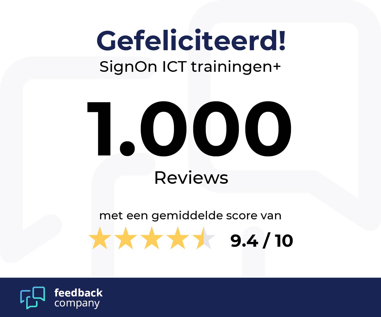 Iedere dag verzorgen de meest ervaren trainers onze trainingen, gemotiveerd en enthousiast: SignOn gaat altijd voor het beste resultaat voor onze cursisten. Daar doen we onze uiterste best voor. Dat betekent dat we continu de kwaliteit van onze trainingen peilen en deze verbeteren waar dat mogelijk is. En natuurlijk dat we ook bij het ontwikkelen van nieuwe cursussen de lat hoog leggen. Daarom vinden we het best bijzonder om te zien dat inmiddels 1.000 deelnemers een review hebben achtergelaten via Feedback Company.