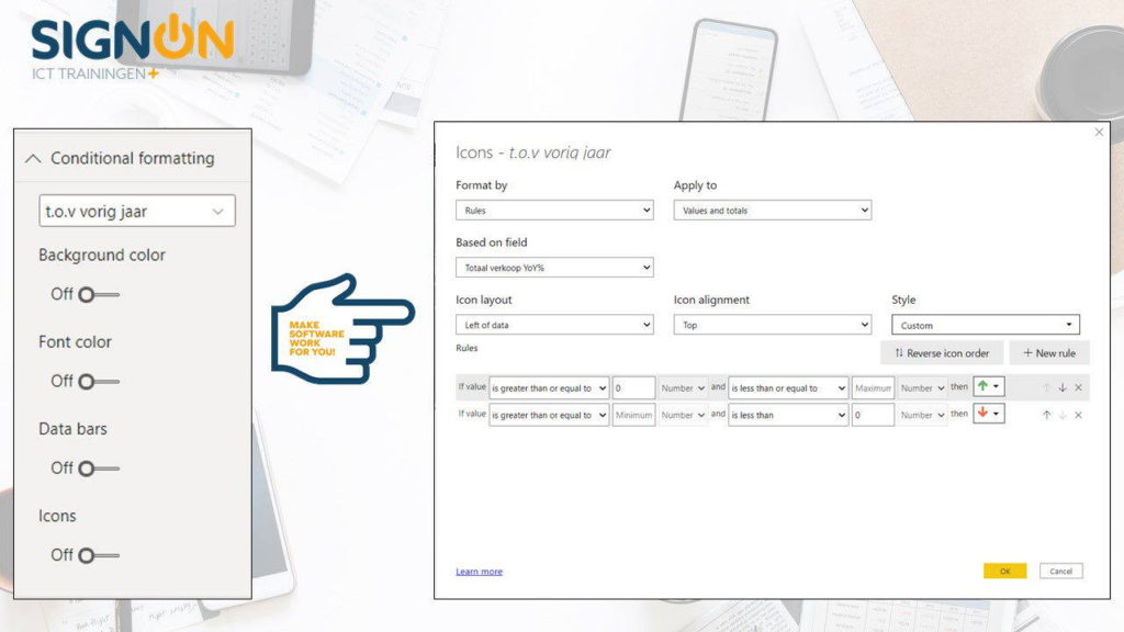 In de tabel en matrix visuals van Power BI kun je op regelniveau voorwaardelijke opmaak (conditional formatting) gebruiken om de aandacht te vestigen op bepaalde cijfers. Gebruik bijvoorbeeld iconen om stijgingen of dalingen duidelijker aan te geven.