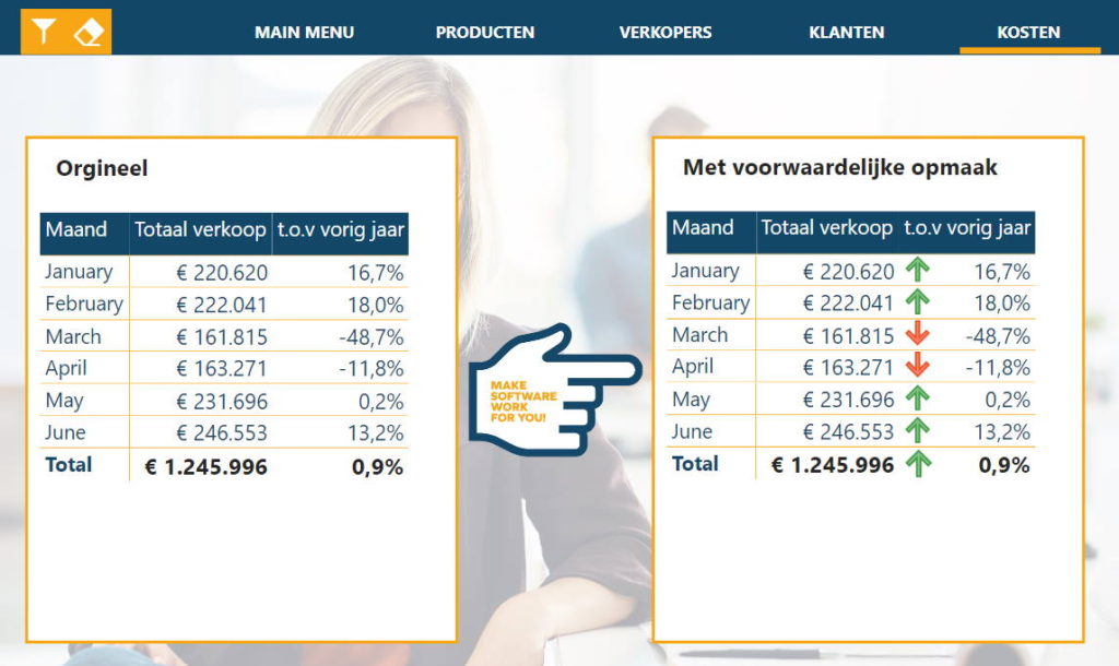 Onderstaand op afbeelding 1 zie je links de originele data in Power BI. Rechts zie je hoe deze data eruit ziet met voorwaardelijke opmaak (zie de rode en groene pijltjes).