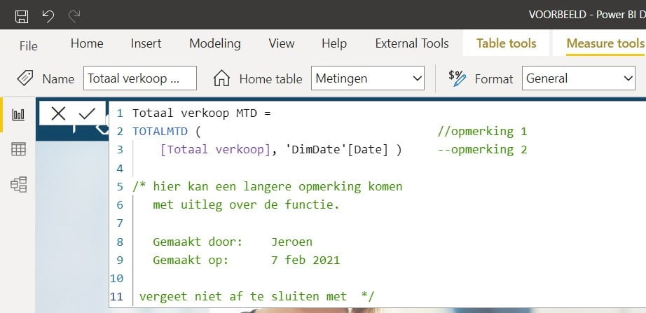 Bij het maken van complexere of langere DAX formules in Power BI, kun je opmerkingen aanbrengen in je formule. Deze opmerkingen zijn heel handig als iemand later de functies moet aanpassen of controleren.
