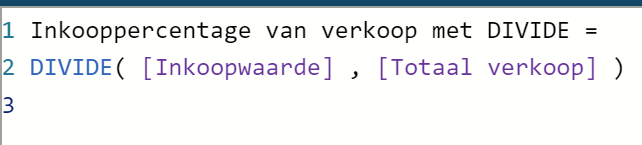 Als je met DAX een deling wil uitrekenen in een meting, dan kun je dat (net als in Excel) doen met een slash symbool ( / ). Zie onderstaande afbeelding:
