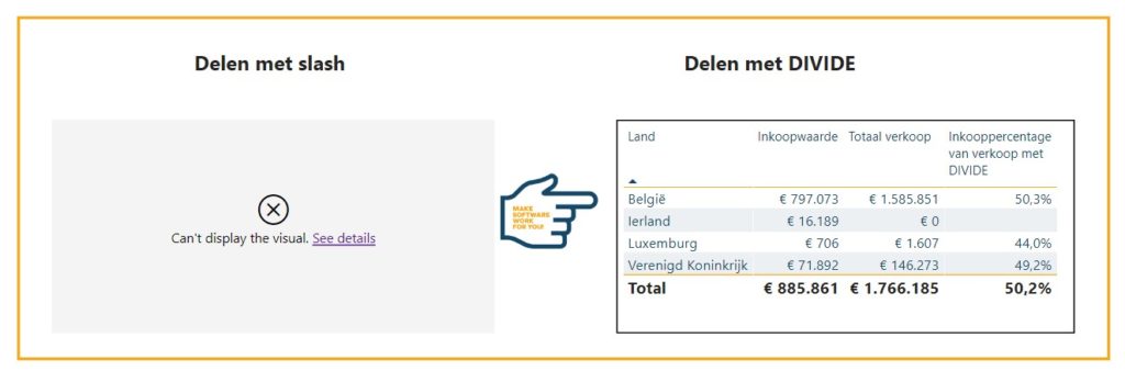 In onderstaande afbeelding zie je links een resultaat waarbij de slash is gebruikt. En rechts een afbeelding waarbij de DIVIDE functie is toegepast. Gebruik dus altijd DIVIDE in plaats van / (slash) dit voorkomt problemen.