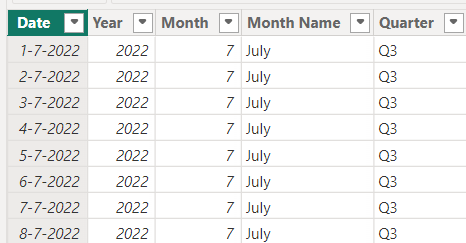 Een datumtabel is een dimensietabel waarin elke rij een unieke datum vertegenwoordigt. Met deze tabel kun je je datamodel filteren op bijvoorbeeld maand, jaar of kwartaal.