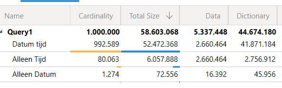 Dit effect wordt duidelijk zichtbaar wanneer je de data analyseert met tools zoals DAX Studio. Stel, je hebt een tabel met 1 miljoen ‘datumtijd’-waarden over een periode van vier jaar. Door de ‘datumtijd’-waarde op te splitsen in aparte datum- en tijdkolommen, kun je de opslagruimte aanzienlijk verminderen en de prestaties van je Power BI-rapporten verbeteren.