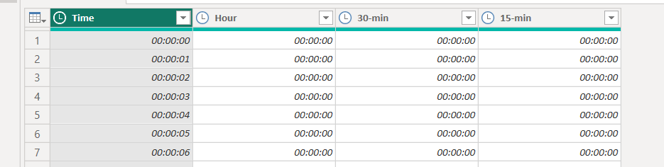 List.Times(#time(0,0,0), 24*60*60, #duration(0,0,0,1)),