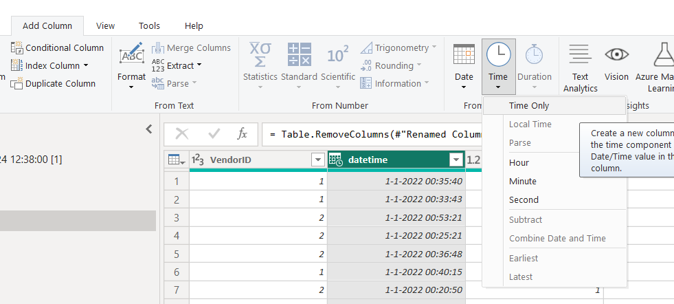 2. Ga naar het menu “Add Column” en kies voor “Time” en vervolgens “Time Only.” Dit creëert een nieuwe kolom met alleen de tijdwaarden.