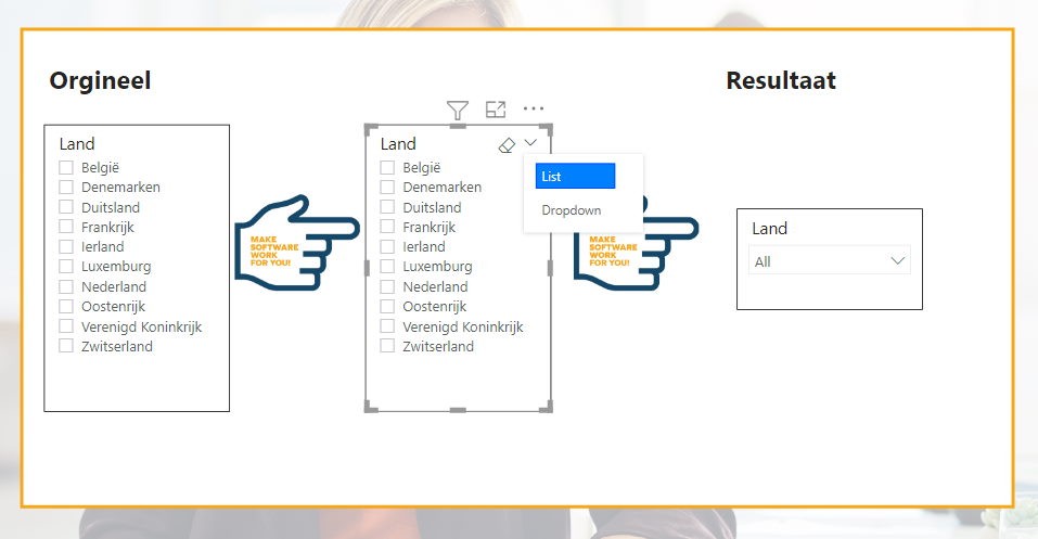 In onderstaande afbeelding zie je aan de linkerkant de ‘lijst slicer’. Wanneer je deze aanpast naar de ‘dropdown slicer’ zie je rechts het resultaat.