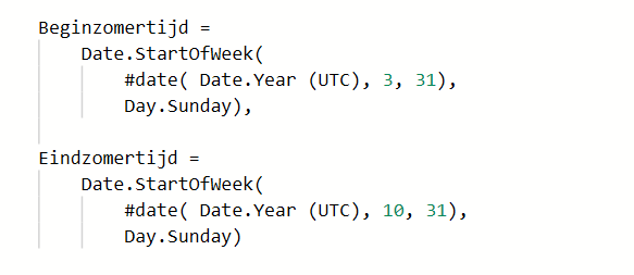 In de volgende stap wil ik het begin en het einde van de zomertijd vaststellen. In Europa is dat altijd de laatste zondag van maart en de laatste zondag van oktober. Dit is dus ieder jaar een andere datum. Om deze te bepalen gebruik ik de functie Date.StartOfWeek op de laatste dag van maart en oktober van het jaar. Dit jaar moet ik halen uit de ‘UTC’ stap.