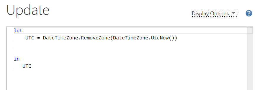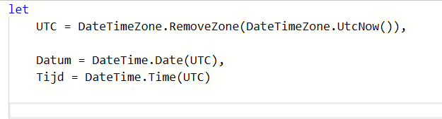 Iedere M query begint met de Let Expressie, hierna kunnen de variabelen (stappen) bepaald worden. De eerste stap die ik hier nodig heb is de UTC-tijd. Hiervoor gebruik ik de functie DateTimeZone.UtcNow.