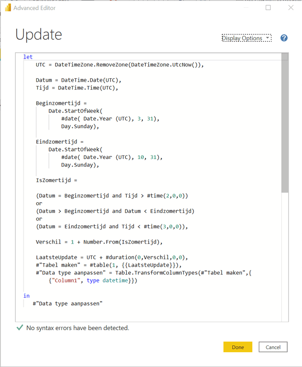 Zoals je kan zien loopt deze tijd nu 2 uur achter. Tijdens het uitvoeren van query (de verversing van de dataset) gebruikt de Power BI service namelijk altijd de UTC-tijd. Dit is een internationale standaardtijd die gelijk is aan de Engelse wintertijd.