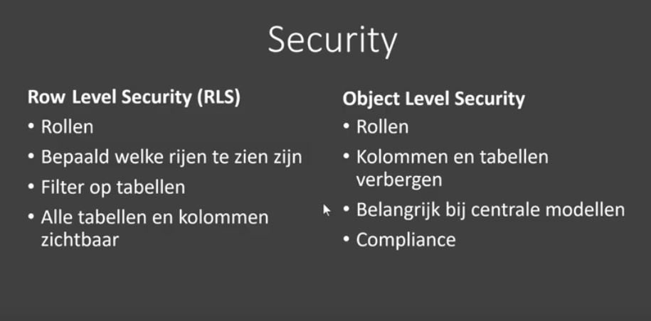 De Row Level security bestaat uiteraard al langer in Power BI. Hiermee kan je rollen maken en bepalen welke datarijen gebruikers met een rol kunnen zien. Je geeft groepen gebruikers hiermee een gefilterde versie van je gegevensset. Ze zien niet alle rijen, maar wel alle tabellen en kolommen.