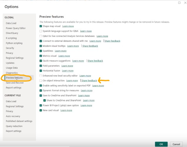 Het nieuwe design kan al worden bekeken via de ‘Preview’ opties. Je kan het nieuwe design dus al aanzetten en ermee werken. Wil je alvast aan de slag in het nieuwe uiterlijk van Power BI Desktop? In het begin van bovenstaande video legt Jeroen uit hoe je dit doet. In slechts 60 sec heb je het nieuwe design geactiveerd. Of gebruik onderstaand stappenplan: